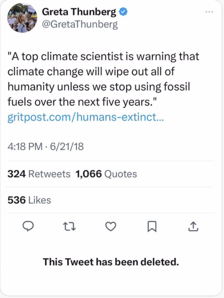 En 2018, la teórica de la conspiración sueca y actriz profesional de la rabia climática Greta Thunberg compartió un tuit declarando que el mundo terminaría en 2023 porque la «ciencia».