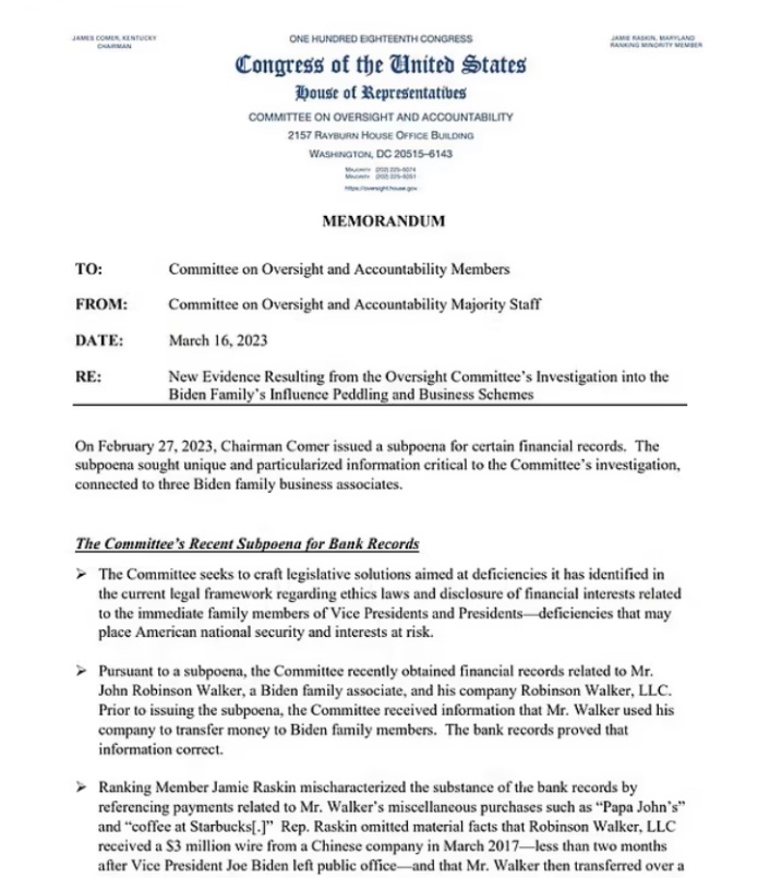 El memorando bomba muestra que los republicanos están ampliando su investigación sobre si la familia Biden usó sus nombres para sacar provecho de empresas en todo el mundo.