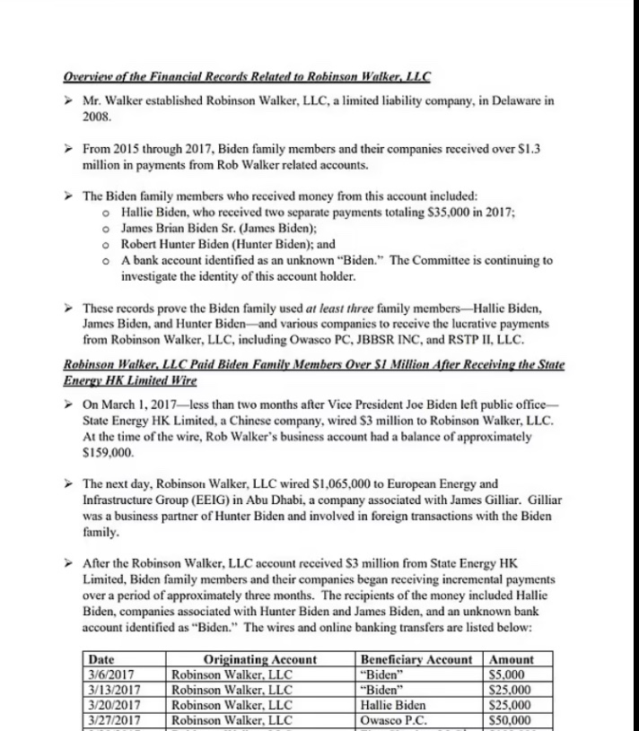 «Después de que la compañía china transfirió a Robinson Walker, LLC los 3 millones de dólares, la familia Biden recibió aproximadamente 1.065.692 dólares durante un período de tres meses en diferentes cuentas bancarias. En particular, la EEIG, la empresa afiliada de James Gilliar, recibió casi exactamente la misma cantidad, 1.065.000 dólares, el 2 de marzo de 2017.