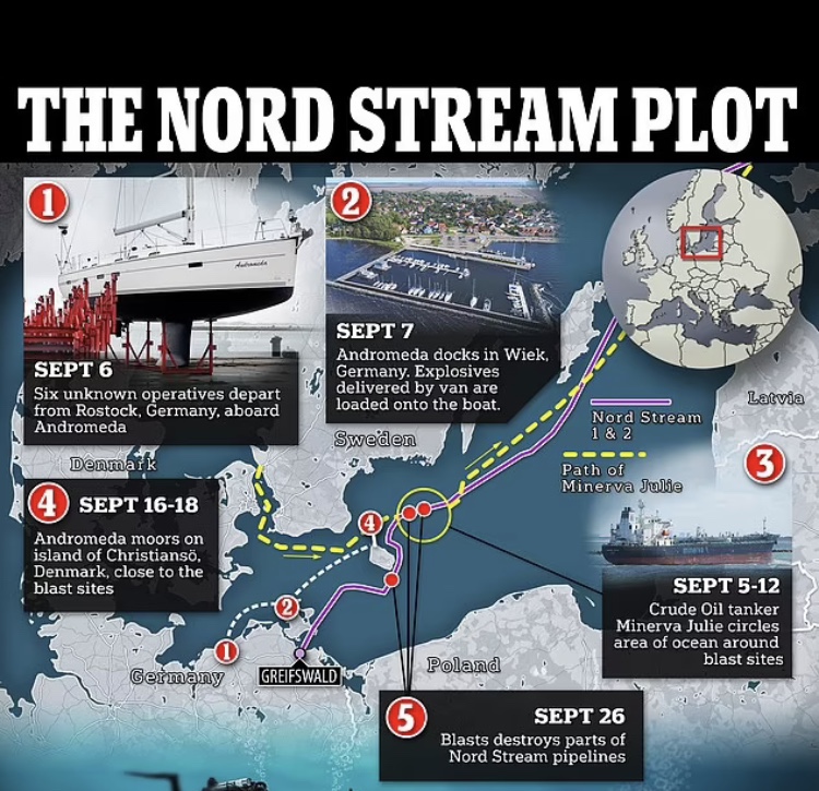 Los investigadores ahora se han centrado en un yate de vela de 50 pies, llamado Andrómeda, como una pieza crucial en el rompecabezas. Andrómeda salió de un puerto alemán a principios de septiembre llevando a seis personas que alquilaron el barco con pasaportes falsos de alta calidad, y luego se embarcaron en un viaje que lo llevó directamente sobre el área de la explosión.