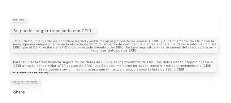 Más tarde ese día, Hamlin respondió: «Sí, eres bueno para seguir trabajando con CEIR. CEIR firmó un acuerdo de confidencialidad [acuerdo de no divulgación] con ERIC con el propósito de ayudar a ERIC y a los miembros de ERIC con la eficacia de la investigación independiente de ERIC». (No está claro cuándo se firmó este acuerdo y si ERIC tiene acuerdos similares con otros terceros).