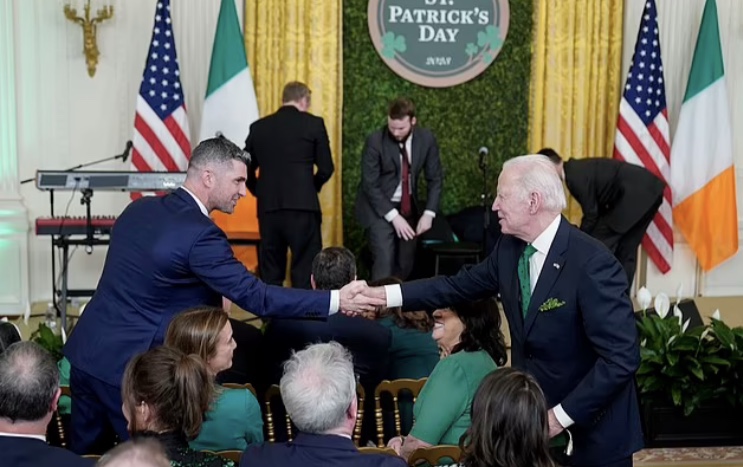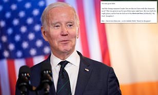 Durante el discurso, el Sr. Biden también bromeó diciendo que a pesar de que su padre era inglés, su «gracia de salvar era una cuarta parte de su familia era Hanafees de Galway».