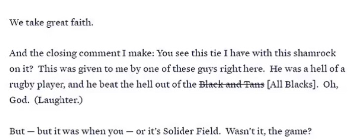 La versión de entrega del discurso en el sitio web de la Casa Blanca tiene los Black and Tans tachados y «All Blacks» añadido entre paréntesis.