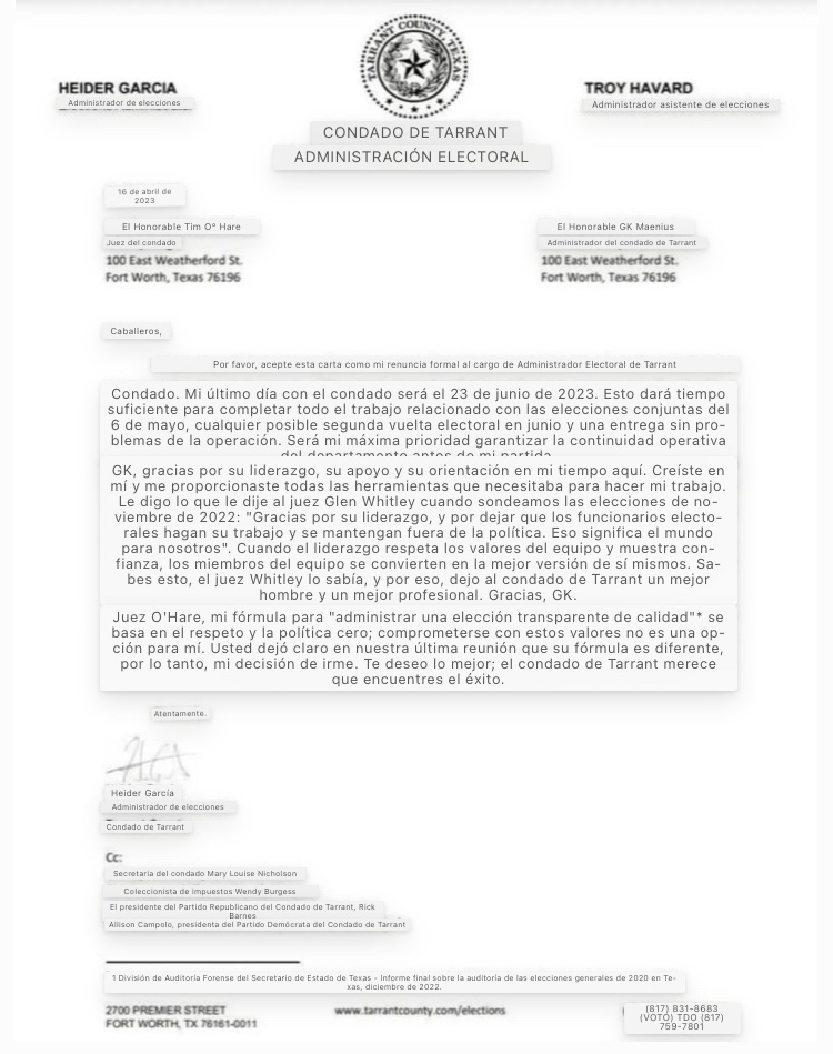 Heider García, el Administrador Electoral del Condado de Tarrant, Texas, ha presentado su renuncia al juez del Condado de Tarrant, Tim O’Hare, a partir del 23 de junio de 2023.