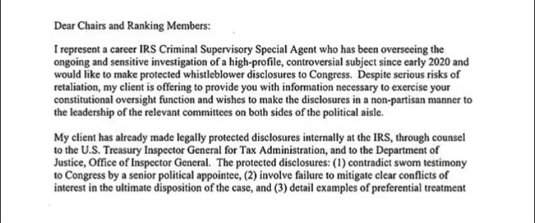 Dijo que su cliente es un agente especial supervisor criminal del IRS de carrera que ha estado supervisando la «investigación sensible de un tema de alto perfil y controvertido» desde 2020.