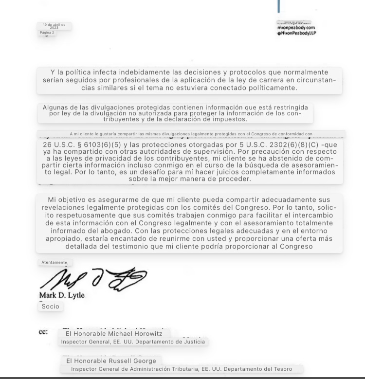 Ya ha compartido información con el IG del Tesoro para la Administración Tributaria, y el IG del Departamento de Justicia, y quiere proporcionar más información al Congreso, donde los comités liderados por la Cámara de Representantes y los republicanos y los senadores republicanos ya han estado investigando al hijo del presidente.