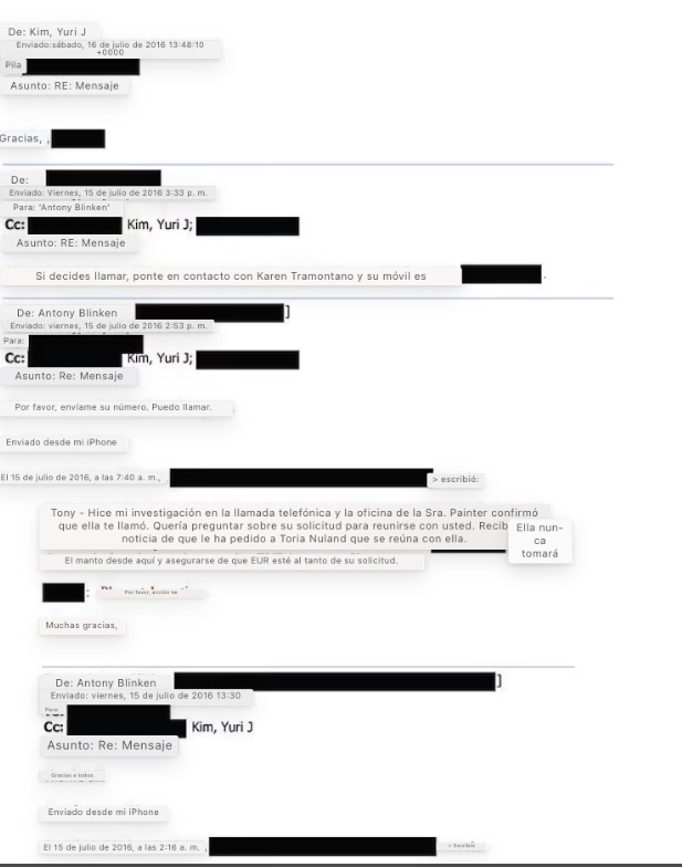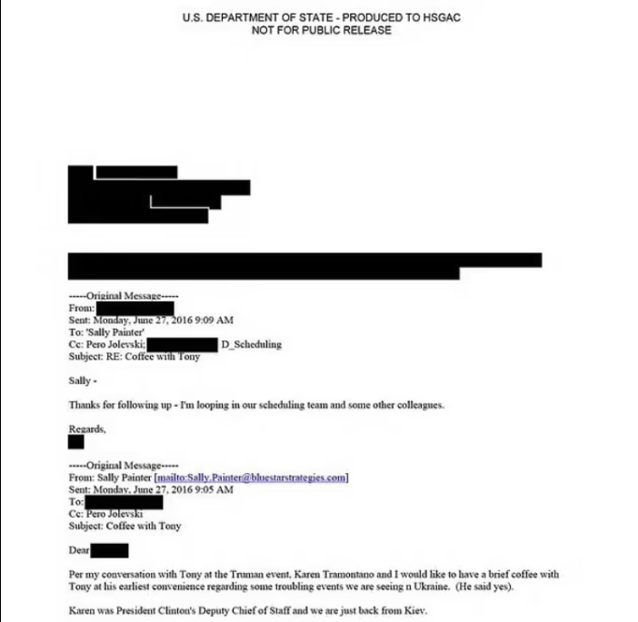 Los correos electrónicos del Departamento de Estado obtenidos por el Comité de Seguridad Nacional muestran que el 27 de junio de 2016, Painter escribió a la asistente de Blinken desde su dirección de correo electrónico de Blue Star sobre una reunión que acordó cuando se topó con ellos en un evento tres días antes.