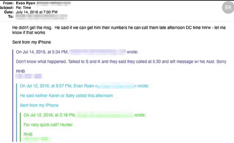 No sé qué pasó. Hablaron con S y K y dijeron que llamaron a las 5:30 y dejaron un mensaje con su Asst. Lo siento’, escribió Hunter. Ella respondió: «Él no ha recibido el mensaje. Dijo que si podemos conseguirle sus números, puede llamarlos a última hora de la tarde, hora de DC, mañana. Avísame si eso funciona.
