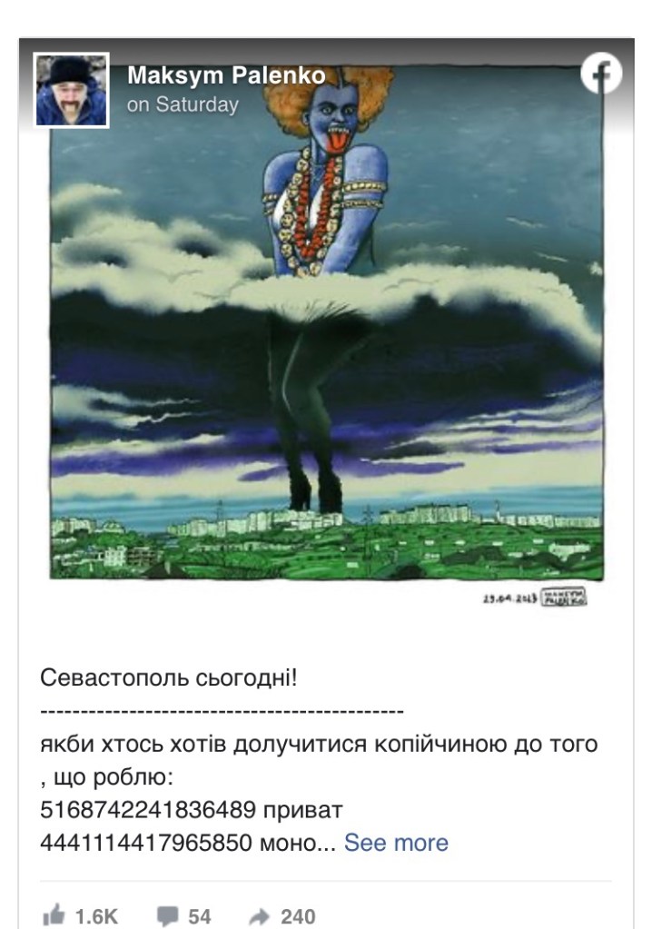 Palenko parece haber utilizado Kali como inspiración en otra obra de arte reciente, una imagen que aparentemente expresa su gratitud a la músico Lady Gaga por apoyar a Ucrania en los comentarios en los Premios SAG de este año. A diferencia de la imagen de Sebastopol, Kali no parece aparentemente sexualizada en la imagen, sino que lleva un collar con las cabezas del prominente líder ruso, incluido Vladimir Putin, y un águila muerta de dos cabezas, un símbolo de la Federación Rusa. Esa imagen ya no aparecía en el perfil de Instagram de Palenko.
