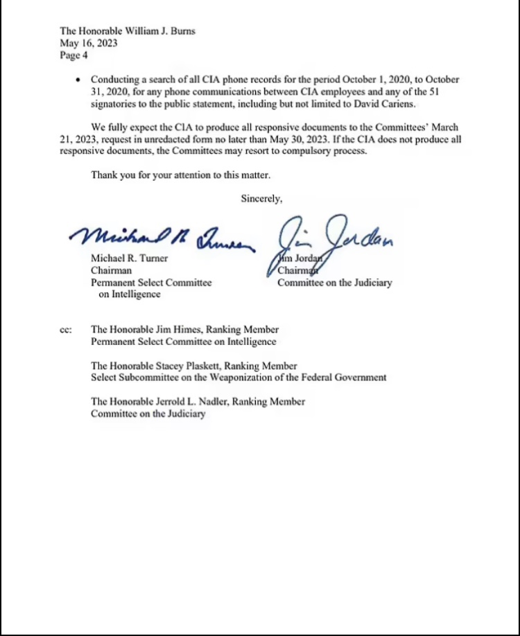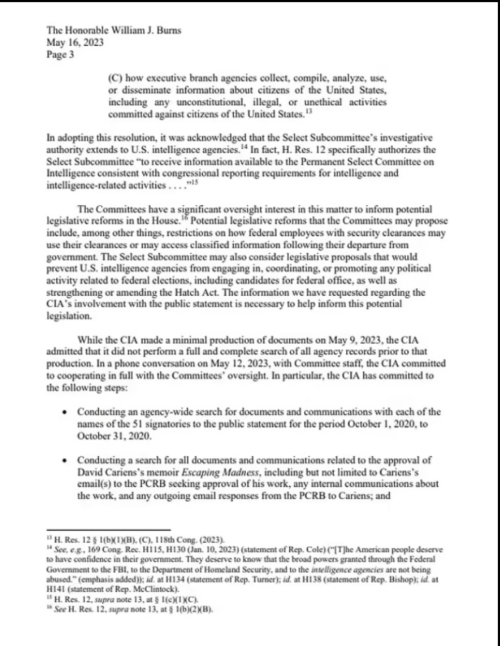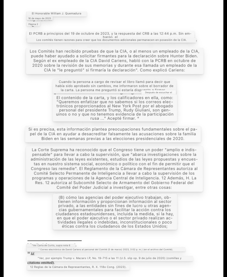 «Los Comités han recibido pruebas de que la CIA, o al menos un empleado de la CIA, puede haber ayudado a solicitar firmantes para la declaración sobre Hunter Biden».