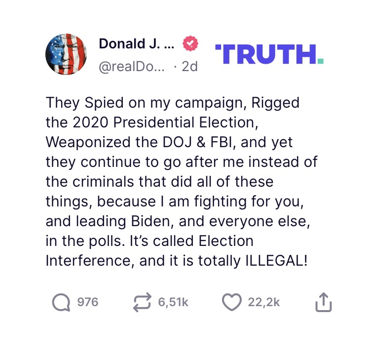 «Ellos espiaron mi campaña, amaman las elecciones presidenciales de 2020, armaron al Departamento de Justicia y al FBI y, sin embargo, continúan persiguiéndome en lugar de a los criminales que hicieron todas estas cosas, porque estoy luchando por ti, y liderando a Biden, y a todos los demás, en las encuestas. Se llama Interferencia Electoral, ¡y es totalmente ILEGAL!» Trump escribió.
