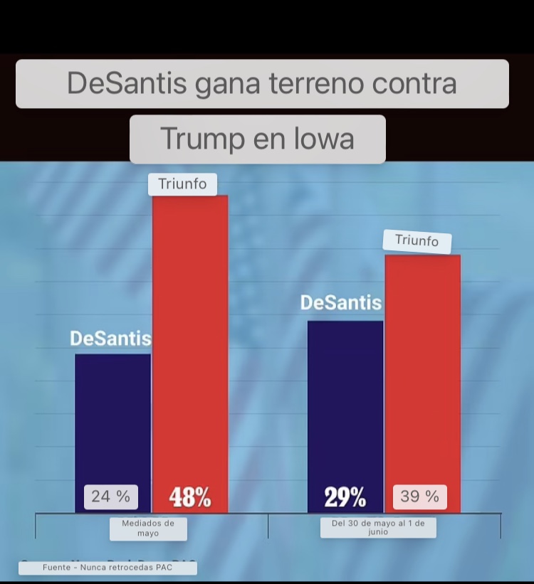 A mediados de mayo, antes de que DeSantis anunciara oficialmente su candidatura presidencial en un evento de Twitter Spaces con Elon Musk, ganó un 24 por ciento en las encuestas de Iowa en comparación con el 48 por ciento de Trump, una brecha del 24 por ciento.