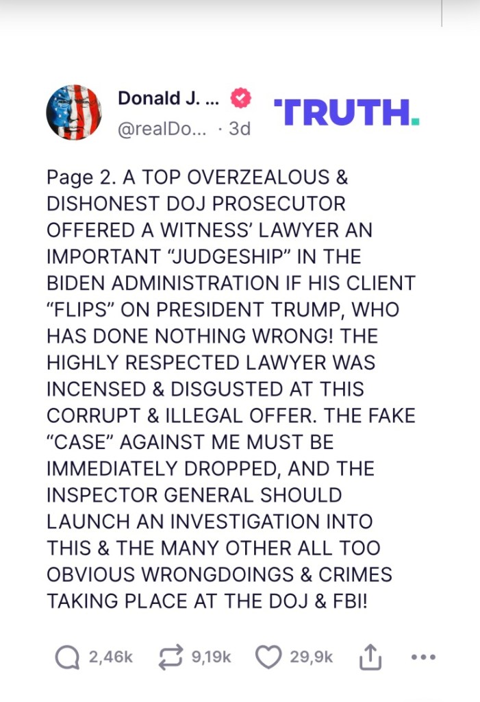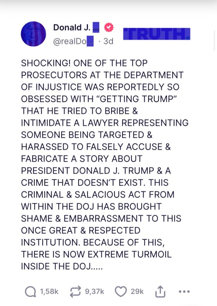 El presidente Trump publicó esto en Truth Social sobre este abuso judicial criminal.
