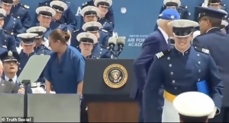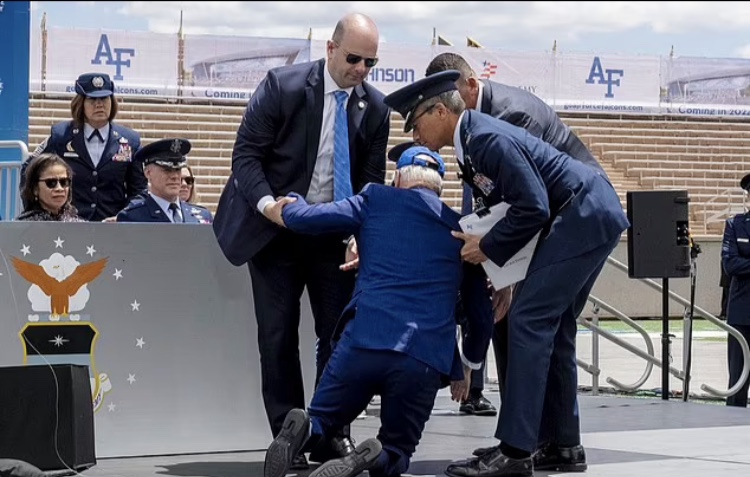 Biden, de 80 años, se rió de la vergonzosa caída en la Academia de la Fuerza Aérea de los Estados Unidos y bromeó: «Me puse una bolsa de arena», antes de insistir en que estaba bien.