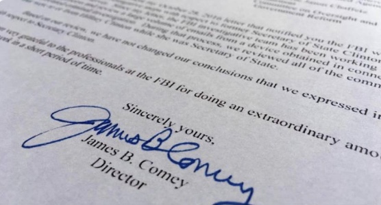 Un año más tarde, en una dramática conferencia de prensa de julio de 2016 menos de tres semanas antes de que Clinton aceptara la nominación de su partido a la presidencia, Comey aclaró unilateralmente a Clinton de las irregularidades criminales. Si bien Clinton y sus ayudantes «fueron extremadamente descuidados en su manejo de información muy sensible y altamente clasificada», dijo, «ningún cargo es apropiado en este caso».