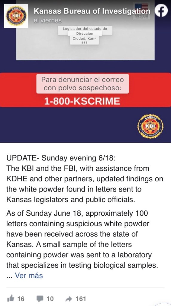 Los agentes de KBI que trabajan junto al FBI, KDHE, OSFM, la Guardia Nacional de Kansas, KHP y varios departamentos de policía locales, oficinas del sheriff y departamentos de bomberos han respondido después de que los legisladores y otros funcionarios públicos recibieran correo que contenía un polvo blanco sospechoso.
