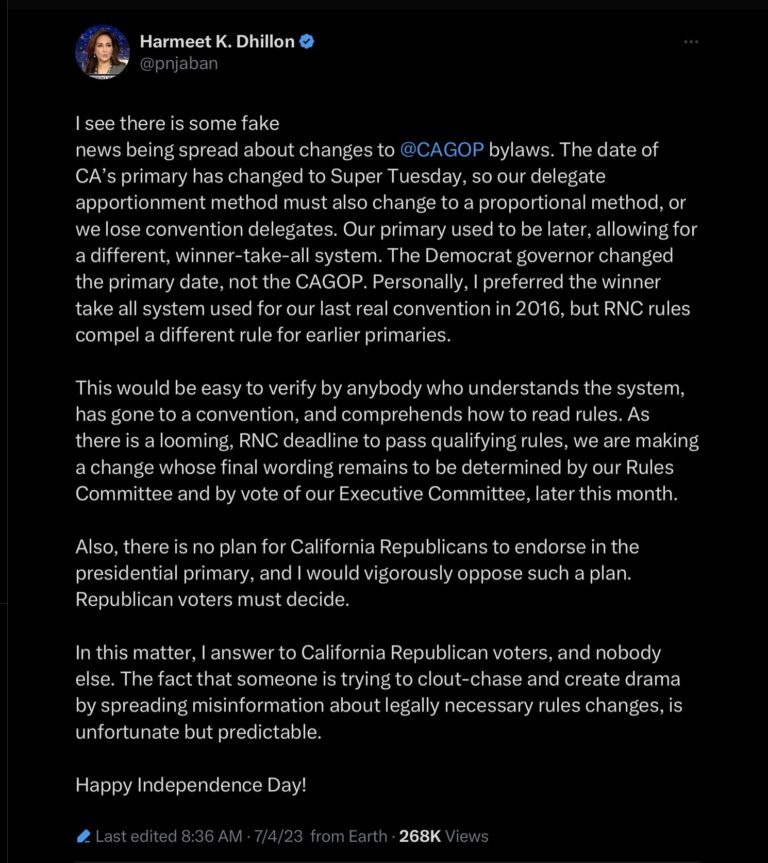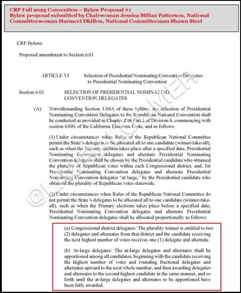 [Laura Loomer] – Aquí está la documentación EXCLUSIVA que obtuve que demuestra lo que dije a continuación hace unos días con respecto a cómo el [GOP de California], específicamente la presidenta de CAGOP Jessica Patterson, Harmeet Dhillon y Shawn Steel están tratando de enmendar los estatutos con respecto al proceso de delegación presidencial en California.