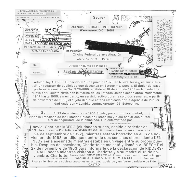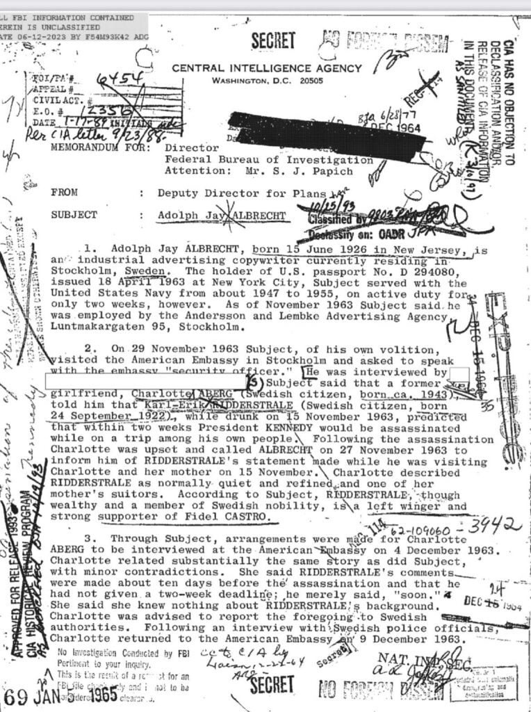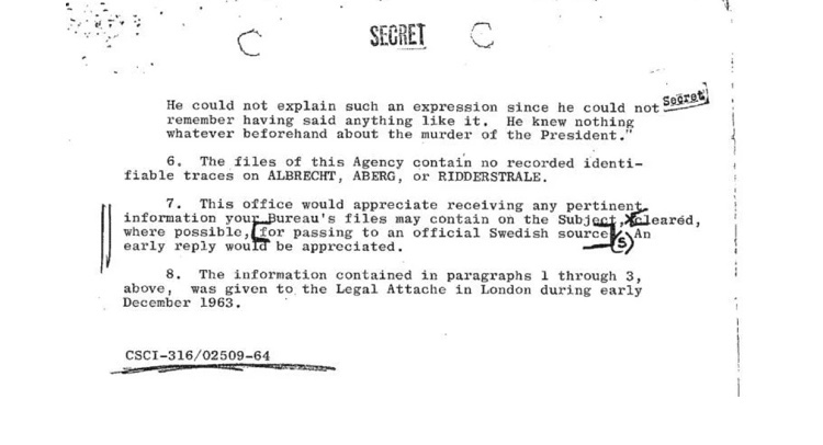 En el último volcado de archivos de JFK, un documento que se originó en la CIA reveló que un estadounidense de Nueva Jersey llamado Jay Albrecht, que residía en Estocolmo, Suecia, entró en la embajada de los Estados Unidos en Estocolmo el 29 de noviembre de 1963 y pidió hablar con un oficial de la embajada.
