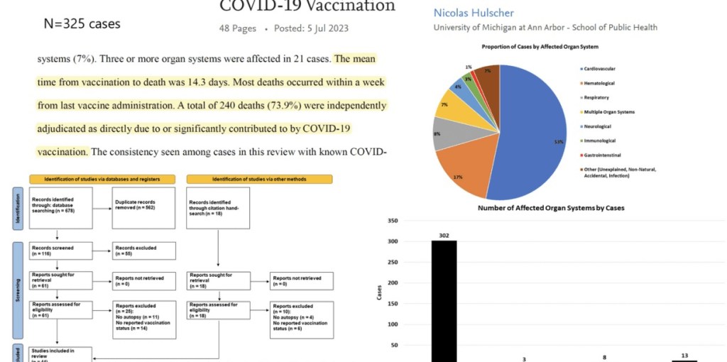 «Métodos: Buscamos todos los informes de autopsia y necropsia publicados relacionados con la vacunación contra la COVID-19 hasta el 18 de mayo de 2023. Inicialmente identificamos 678 estudios y, después de examinar nuestros criterios de inclusión, incluimos 44 documentos que contenían 325 casos de autopsia y un caso de necropsia. Tres médicos revisaron de forma independiente todas las muertes y determinaron si la vacunación contra la COVID-19 era la causa directa o sitribuía significativamente a la muerte.