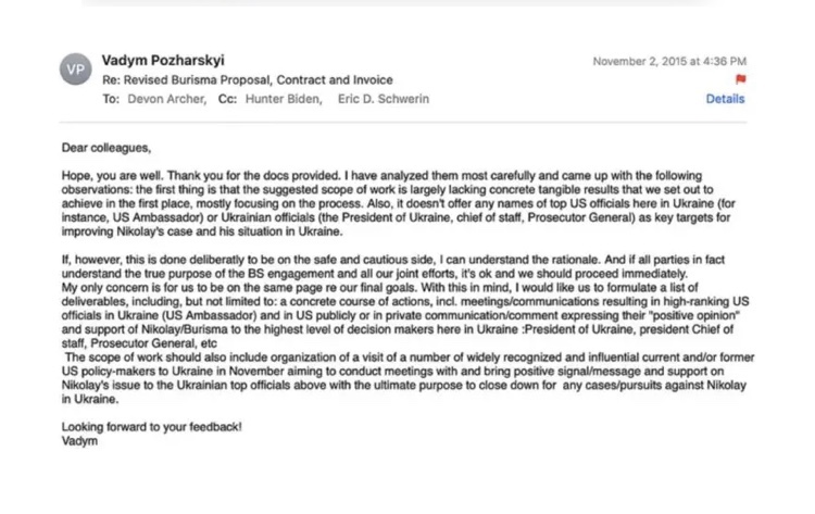 Los correos electrónicos recuperados del portátil abandonado de Hunter Biden revelan una comunicación que se transmitió el 2 de noviembre de 2015. Vadym Pozharskyi, un ejecutivo de Burisma, se puso en contacto con Hunter Biden, quien ocupaba un puesto en la junta directiva de la compañía en ese momento. El correo electrónico también incluía a Devon Archer, otro miembro de la junta, y a Eric Schwerin, el presidente de Rosemont Seneca Partners. La correspondencia se centró en una «propuesta revisada, contrato y factura inicial» de la firma de presión Blue Star Strategies, que había llamado la atención de todas las partes involucradas.