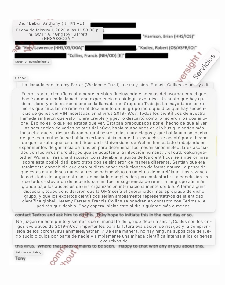 El Subcomité Selecto de la Cámara de Representantes sobre la Pandemia de Coronavirus hizo público el jueves un correo electrónico que plantea preocupaciones con respecto a Anthony Fauci, ex asesor del grupo de trabajo sobre el coronavirus de la Casa Blanca y director del Instituto Nacional de Alergias y Enfermedades Infecciosas (NIAID). El correo electrónico, compartido en la cuenta de Twitter del subcomité, indica que Fauci estaba al tanto de la investigación de ganancia de función que se estaba llevando a cabo en Wuhan, China.