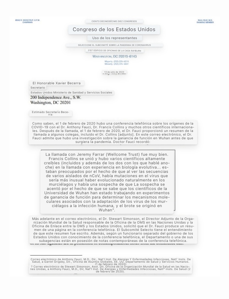 Junto con la divulgación por correo electrónico, el subcomité ha enviado una carta al Secretario de Salud y Servicios Humanos (HHS), Xavier Becerra, exigiendo respuestas con respecto al contenido del correo electrónico y solicitando documentación relacionada con la conferencia telefónica a la que se hace referencia en el correo electrónico de Fauci.