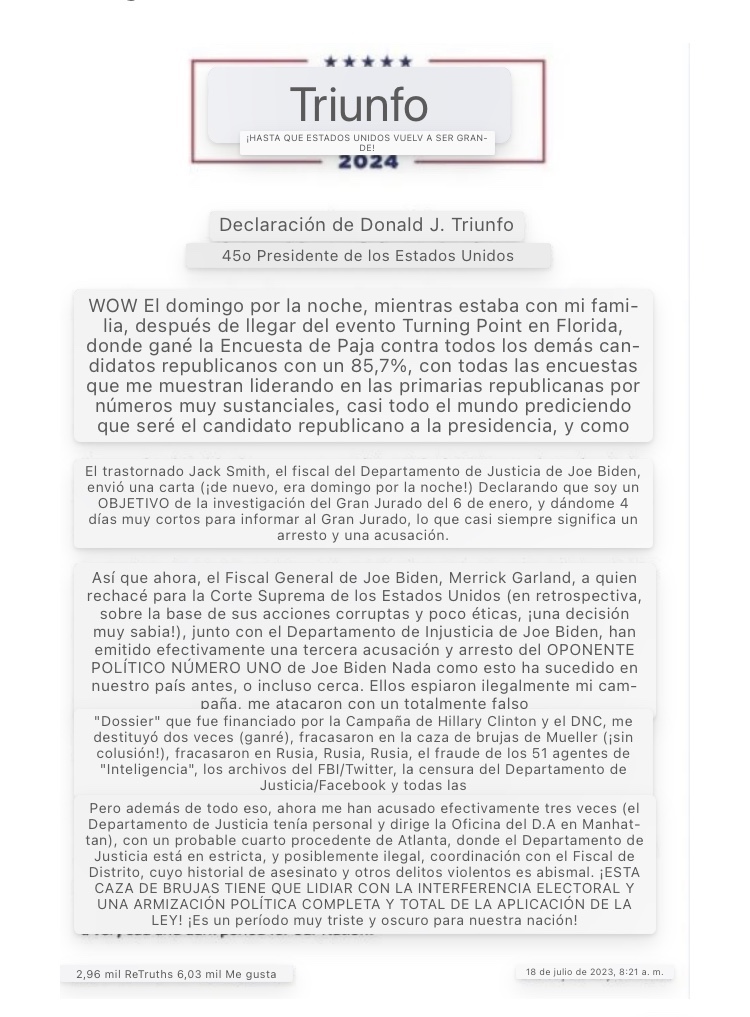 El desquiciado Jack Smith, el fiscal del Departamento de Justicia de Joe Biden, envió una carta (¡de nuevo, era domingo por la noche!) afirmando que soy un OBJETIVO de la investigación del Gran Jurado del 6 de enero, y dándome muy cortos 4 días para informar al Gran Jurado, lo que casi siempre significa un Arresto y Acusación», escribió el expresidente.