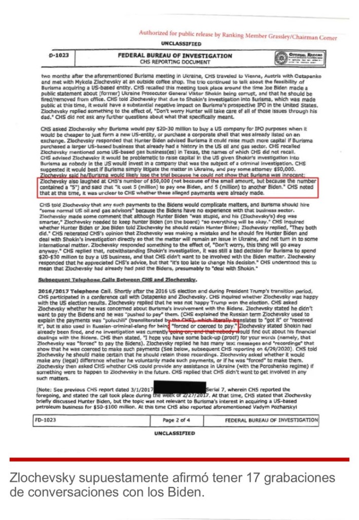 «Zlochevsky respondió que no envió ningún fondo directamente al ‘Big Guy’ (que [la fuente del FBI] entendió que era una referencia a Joe Biden). [La fuente] le preguntó a Zlochevsky cuántas empresas/cuentas bancarias controla Zlochevsky; Zlochevsky respondió que les tomaría (Investigadores) 10 años encontrar los registros (es decir, pagos ilícitos a Joe Biden)».