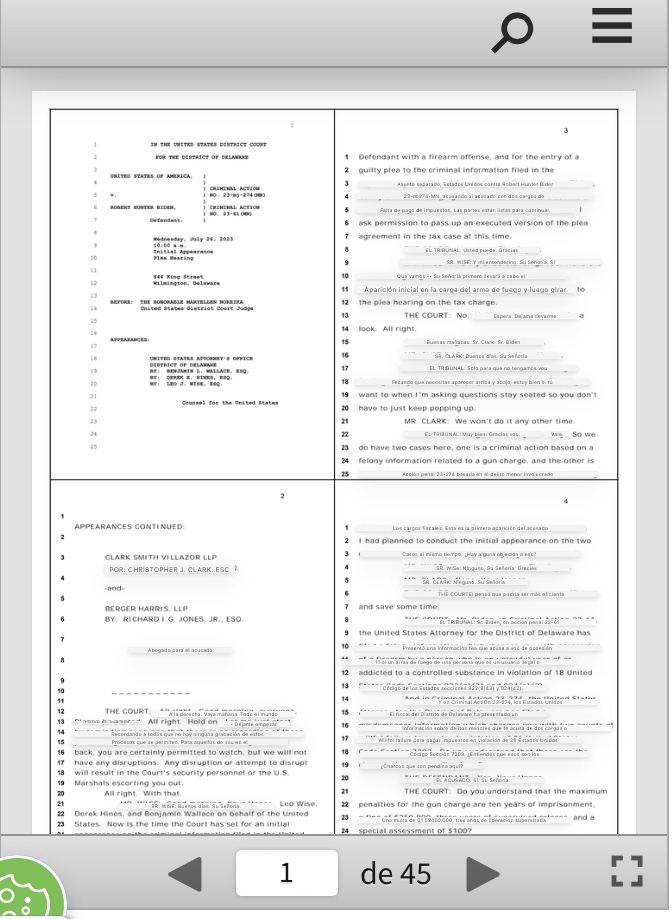Bajo el acuerdo de declaración de culpabilidad propuesto y el acuerdo de desviación, Biden se declararía culpable de dos cargos de impuestos por delitos menores y podría evitar el castigo por un cargo de arma de delito grave si se mantuviera fuera de problemas durante dos años. Pero en una audiencia judicial tensa, EE. UU. La jueza de distrito Maryellen Noreika cuestionó la constitucionalidad del acuerdo de desvío y se negó a firmar el acuerdo, al menos por ahora. Los abogados deben volver a los tribunales en varias semanas para revisar el tema.