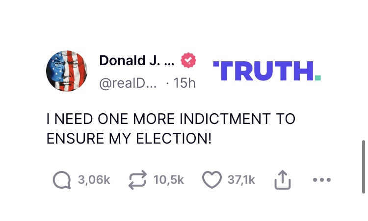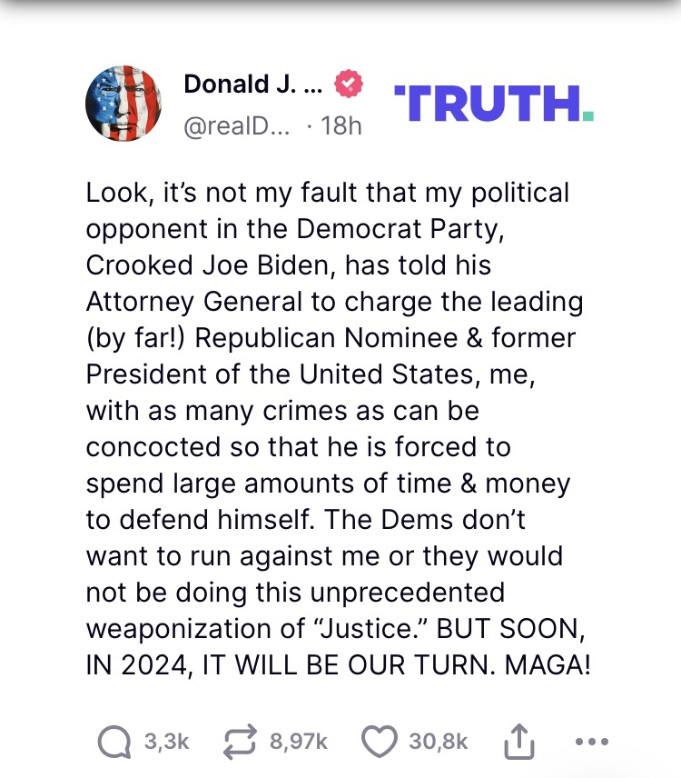 Primero, escribió: «Mira, no es mi culpa que mi oponente político en el Partido Demócrata, Crooked Joe Biden, le haya dicho a su Fiscal General que cobre al líder (¡de lejos!) El candidato republicano y expresidente de los Estados Unidos, yo, con tantos crímenes como se puedan inventar para que se vea obligado a gastar grandes cantidades de tiempo y dinero para defenderse. Los demócratas no quieren correr contra mí o no estarían haciendo esta militarización sin precedentes de la «Justicia». PERO PRONTO, EN 2024, SERÁ NUESTRO TURNO. ¡MAGA!»