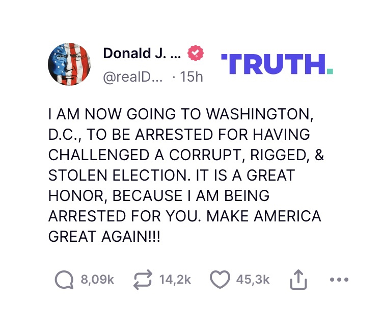 Siguió con un mensaje final antes de partir hacia la capital de la nación, escribiendo: «AHORA VOY A WASHINGTON, D.C., PARA SER ARRESTADO POR HABER DESAFIADO UNA ELECCIÓN CORRUPTA, RIGGED Y ROBADA. ES UN GRAN HONOR, PORQUE ME ESTÁN ARRESTANDO POR TI. ¡¡¡HASTA QUE ESTADOS UNIDOS VUELVA A SER GRANDE!!!»