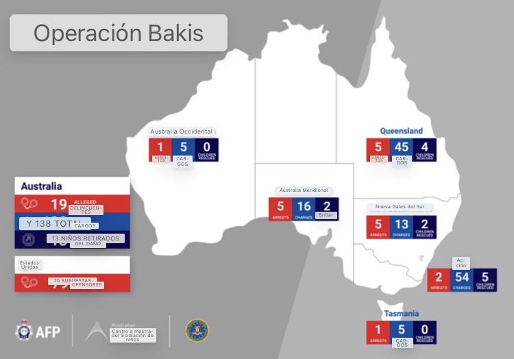 La Policía Federal Australiana anunció el martes que al menos 13 niños fueron rescatados de más daños como resultado de una operación conjunta con el FBI, apodada «Operación Bakis».