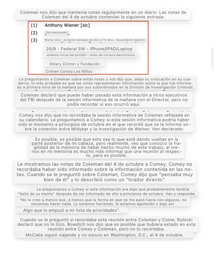 Los grillos que estaba escuchando realmente me estaban haciendo sentir incómodo porque algo se iba a derrumbar… Y mi comprensión, que no está informada porque… no trabajé en el asunto de Hillary Clinton. Lo que entendí en ese momento era que les estaba diciendo a la gente que tengo correos electrónicos privados de Hillary Clinton, el número uno, y mensajes de BlackBerry, el número dos. Te digo que tenemos potencialmente 10 veces el volumen que el director Comey dijo que teníamos en el registro. ¿Por qué no hay nadie aquí? Por ejemplo, si soy el supervisor de cualquier equipo de CI en Seattle y me entero de esto, estoy llevando a la sede y diciendo, oye, algún agente que trabaja en pornografía infantil aquí puede tener correos electrónicos de [Hillary Clinton]. Ponte al teléfono, llama [al agente del caso] y obtengo una copia de esa unidad, porque así es como deberías ser. Y que nadie se puso en contacto conmigo dentro de mí, como, esa noche, todavía hasta el día de hoy, no entiendo qué diablos salió mal.
