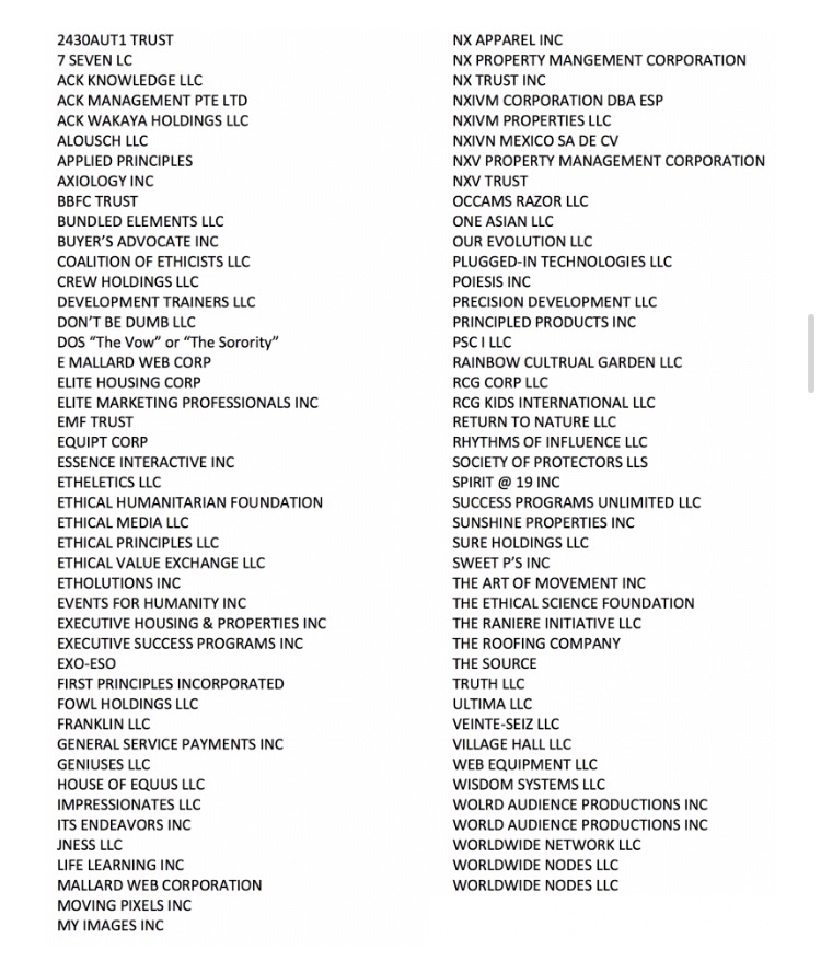 NXIVM a menudo se conoce como un «culto sexual», y con razón. Es un esquema piramidal oscuro que ha existido durante décadas, e incluye la trata de personas, el sexo forzado y el trabajo esclavo, el fraude de cables, el lavado de dinero, el robo de identidad, el chantaje, el fraude de visados, el tráfico sexual infantil, la marca de los cuerpos de las mujeres y el extorsión. Los líderes están bien conectados, respaldados por millones de personas y tienen un ejército de abogados. Sin embargo, les gusta referirse a sí mismos como una organización de capacitación ejecutiva y de concienciación grupal, que abarca 23 estados.