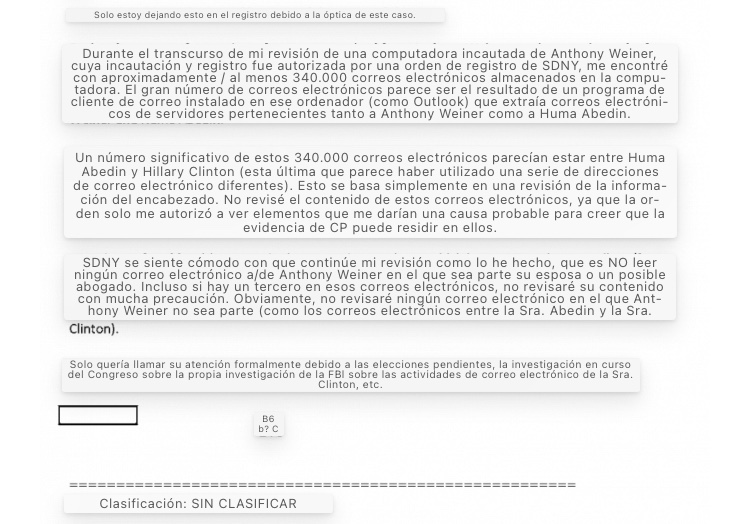 El FBI también publicó un documento que indicaba «Anthony Weiner; Productores de pornografía infantil» con una caja en blanco debajo. Tenga en cuenta que «productores» es plural. También declararon que un número significativo de los 340.000 correos electrónicos estaban entre Huma Abedin y Hillary Clinton.