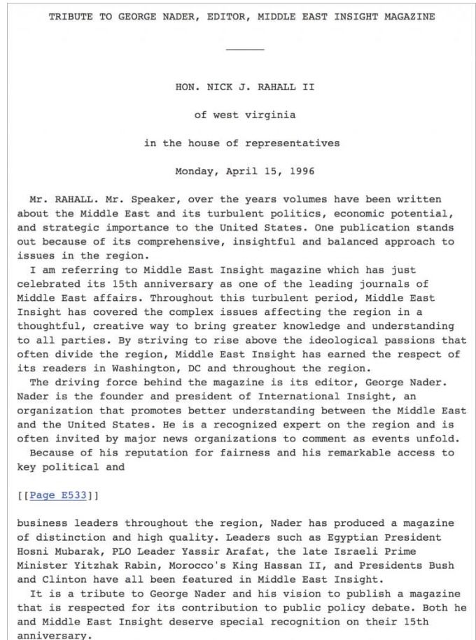 Solo cuatro meses después, en abril de 1996, se hizo un homenaje a Nader y su revista en un informe del Congreso. El informe también deja claro su acceso a líderes políticos y empresariales clave en todo Oriente Medio.