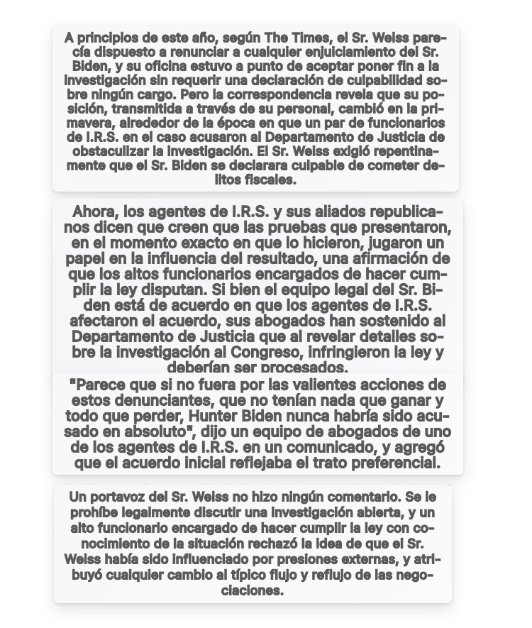 «Pero la correspondencia revela que su posición, transmitida a través de su personal, cambió en la primavera, alrededor de la época en que un par de funcionarios de I.R.S. en el caso acusaron al Departamento de Justicia de obstaculizar la investigación. El Sr. Weiss de repente exigió que el Sr. Biden se declarara culpable de cometer delitos fiscales».
