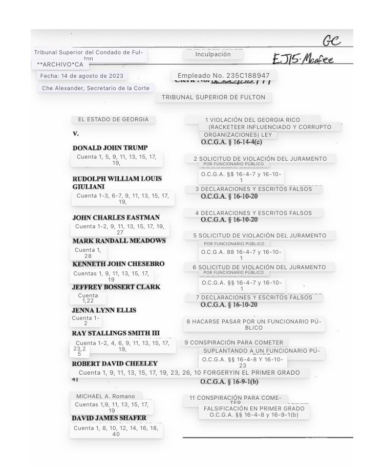 Un gran jurado del condado de Fulton devolvió el lunes pasado una acusación de 41 cargos que incluía RICO y cargos de conspiración contra Trump.