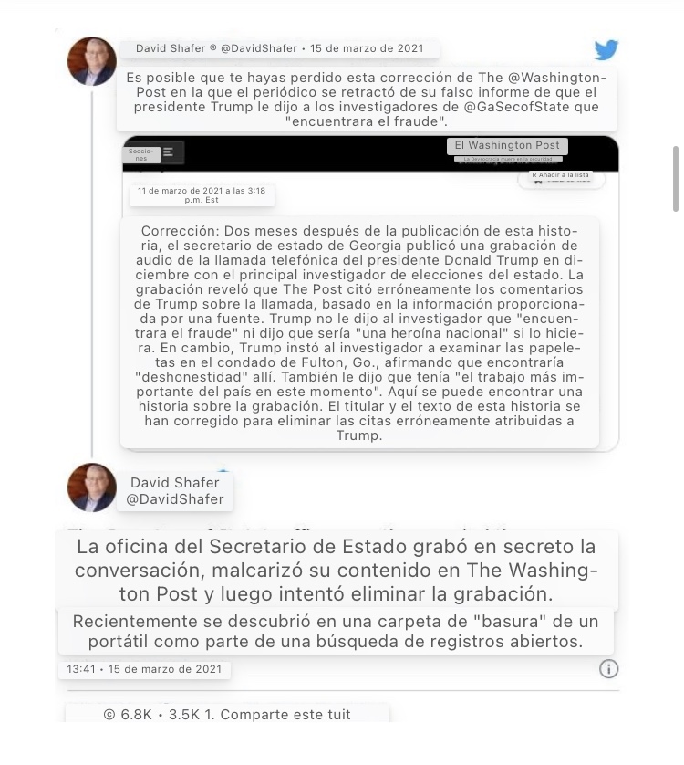 El presidente del Partido Republicano de Georgia, David Shafer, reveló más tarde que Raffensperger y Fuchs mintieron al Washington Post sobre Trump exigiendo que «encuentren el fraude».