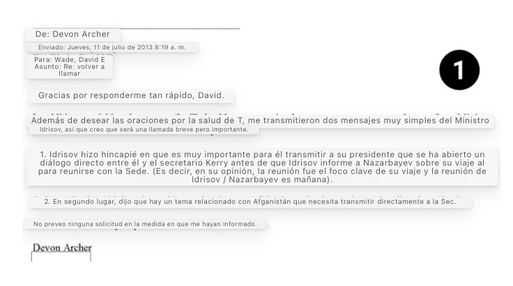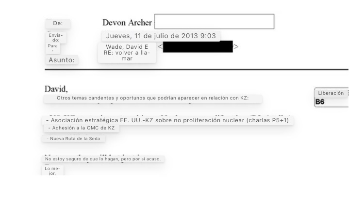 «Devon: entiendo que hablaste con el Secretario para que llamara al Ministro de Relaciones Exteriores Idrisov hoy, ¿puedes decirme los temas de los que Idrisov quiere hablar/cualquier solicitud que tenga del jefe, para que podamos preparar el papel para una llamada», escribió Wade.