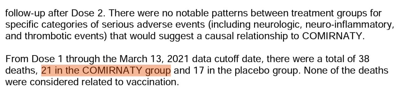 • Y durante un período de 6 meses, 21 de las personas vacunadas murieron por todas las causas, mientras que solo 17 personas murieron en el grupo placebo, una diferencia del 23,5 %.