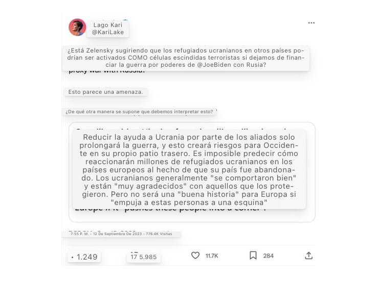 Los comentarios de Zelensky han provocado indignación tanto en Europa como en los Estados Unidos. La ex candidata a la gobernación de Arizona, Kari Lake, dijo en X (anteriormente Twitter): «¿Está Sugiriendo Zelensky que los refugiados ucranianos en otros países podrían ser activados COMO células escindidas terroristas si dejamos de financiar la guerra por poderes de Joe Biden con Rusia? Esto se lee como una amenaza. ¿De qué otra manera se supone que debemos interpretar esto?» ¿L llevará esto a los países de toda Europa a reconsiderar la bienvenida a los refugiados ucranianos?