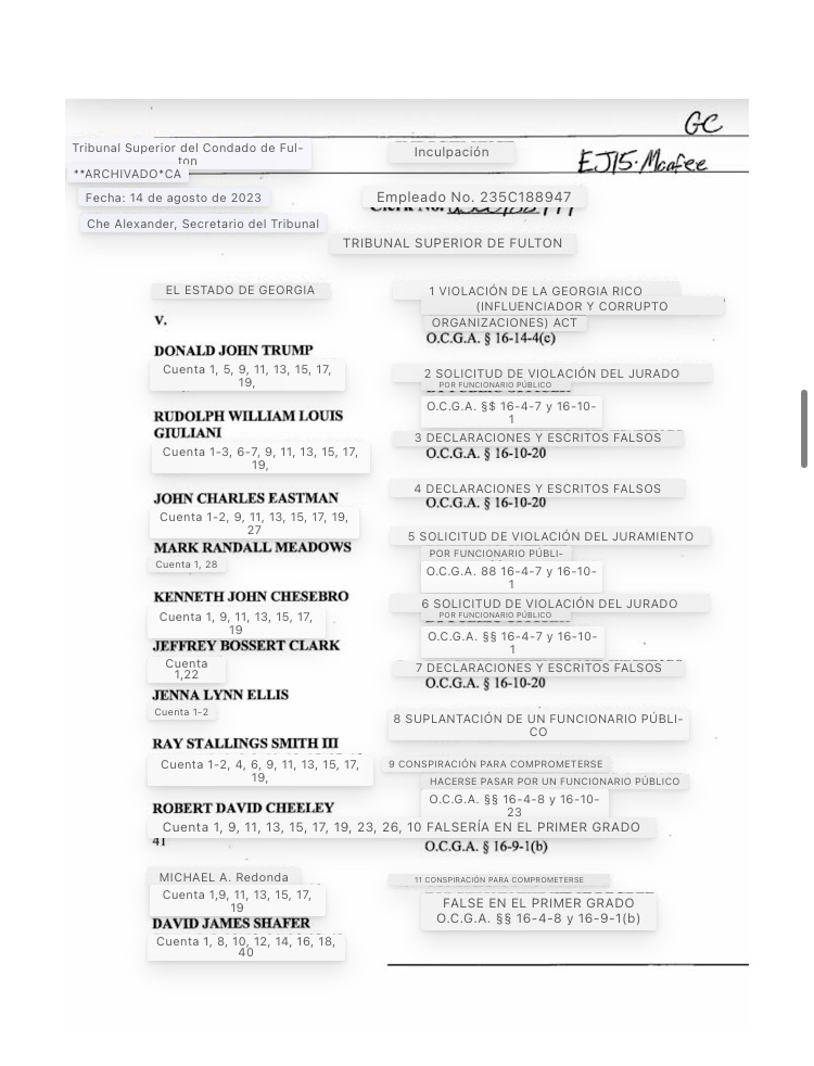 El ex funcionario del Departamento de Justicia de Trump, Jeffrey Clark, fue acusado por un gran jurado del condado de Fulton por dos cargos: 1 (RICO) y 22 (intento criminal de cometer declaraciones y escritos falsos).