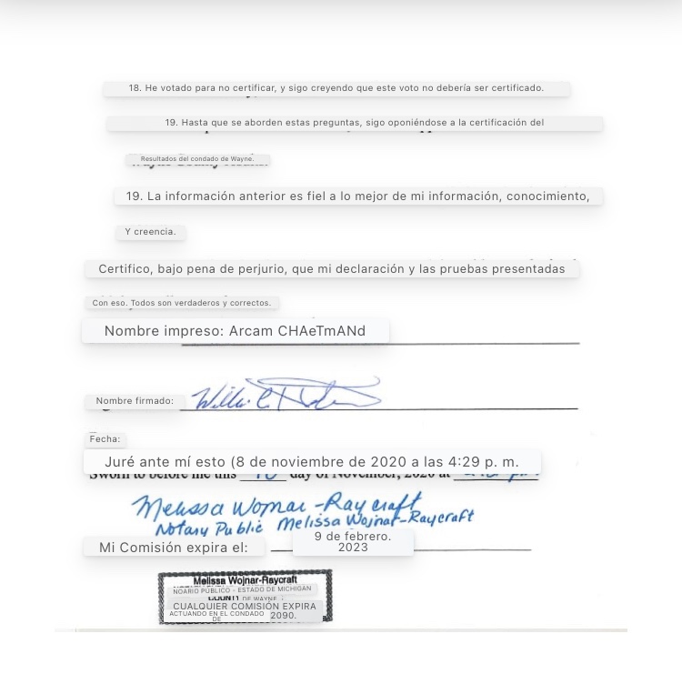 En contraste con las certificaciones de 2016 y 2018 en el condado de Wayne, el papeleo de certificación para las elecciones de 2020 solo fue firmado por dos de los encuestadores del condado. PerMCL 168.24e, según se informa, este NO es un número suficiente de encuestadores para certificar la elección. En otras palabras, los resultados de las elecciones generales de 2020 en el condado de Wayne no fueron certificados legalmente. Esta es una declaración de hecho, no una conjetura.