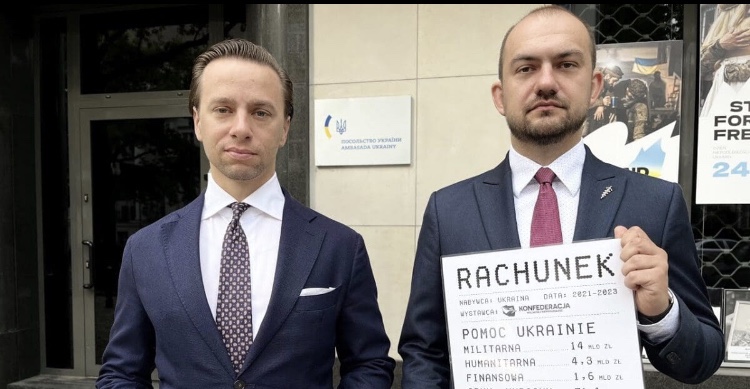 El diputado polaco de derecha Krzysztof Bosak (izquierda) entregó un «proyecto de ley» por 101 mil millones de Zlotys (23 mil millones de dólares) a la embajada de Ucrania en Varsovia el martes, exigiendo que Kiev reembolse la ayuda que ha recibido después de demandar a Polonia ante la Organización Mundial del Comercio por imponer una prohibición a las importaciones de granos de Ucrania.