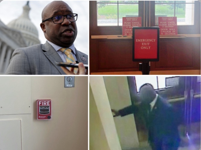 El representante Jamaal Bowman (D-NY) derribó dos carteles que advertÍAN que una puerta del segundo piso en el edificio de oficinas de Cannon House era para uso de emergencia solo antes de tirar de la alarma de incendios y salir corriendo por una puerta diferente en un piso diferente, ha aprendido Breitbart News en exclusiva.