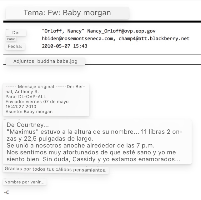 El 7 de mayo de 2010, Biden recibió una foto de «Baby Morgan» con el título adjunto «buddha babe» en un correo electrónico anunciando el nacimiento del bebé de la secretaria de prensa de Jill Biden, el bebé «Maximus» de Courtney O’Donnell, también en su cuenta de «champ4».
