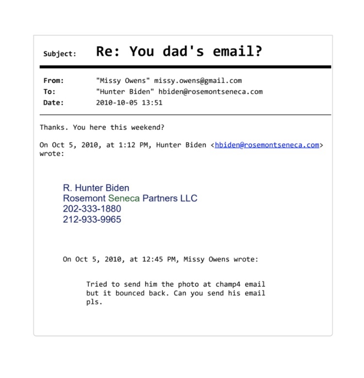 Biden emitió previamente repetidas negaciones de haber discutido negocios con su hijo, pero la creciente evidencia muestra que se reunió y habló con los socios comerciales extranjeros de Hunter en numerosas ocasiones, y también mantuvo correspondencia con Hunter a través de seudónimos. La Casa Blanca de Biden se ha negado a explicar por qué Joe utilizó correos electrónicos no gubernamentales para informar a Hunter Biden sobre los asuntos oficiales del vicepresidente.