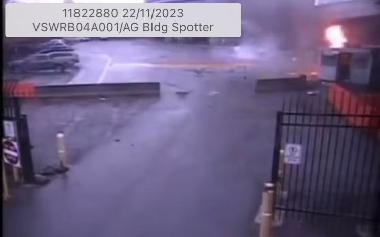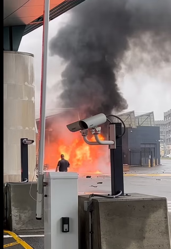 El vehículo que explotó en el puente Rainbow después de irrumpir hacia Estados Unidos desde Canadá esta mañana voló por el aire a alta velocidad antes de estallar en llamas junto a un puesto de control de inmigración.