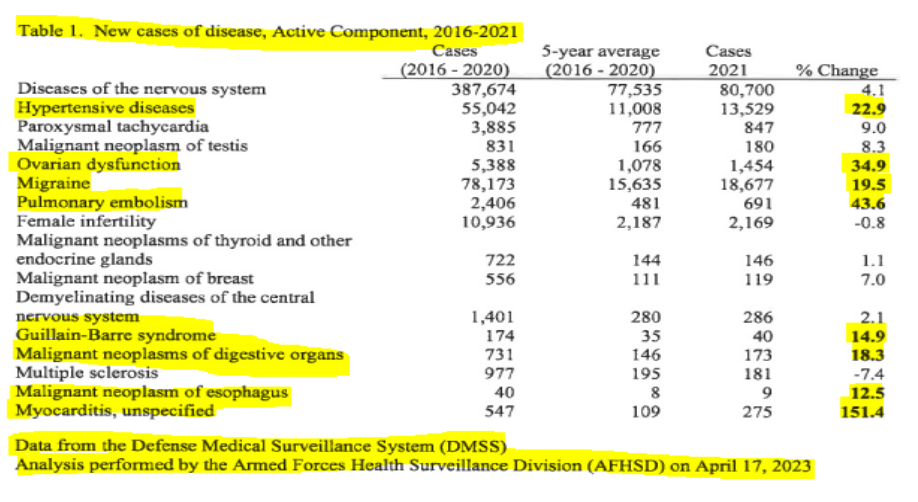 El jueves pasado, durante la audiencia del Subcomité de Servicios Armados de la Cámara de Representantes sobre el monitoreo del coronavirus por parte del Departamento de Defensa, Shauna Stahlman, epidemióloga sénior de la División de Vigilancia de la Salud de las Fuerzas Armadas, intentó racionalizar los aumentos estadísticos en los registros de DMED. doctor Stahlman explicó los aumentos significativos en las enfermedades potencialmente relacionadas con las vacunas al afirmar que los datos entre 2016 y 2020 se corrompieron debido a que un menor número de miembros del servicio estaban registrados para visitas médicas, lo que da un tamaño de muestra más pequeño de personas que sufren lesiones médicas. Pero incluso los datos «corregidos» del DoD muestran un aumento alarmante de las lesiones médicas en categorías clave: un aumento del 34,9 por ciento en la disfunción ovárica, un aumento del 43,6 por ciento en la embolia pulmonar y un aumento del 151,4 por ciento en la miocarditis, no especificado.